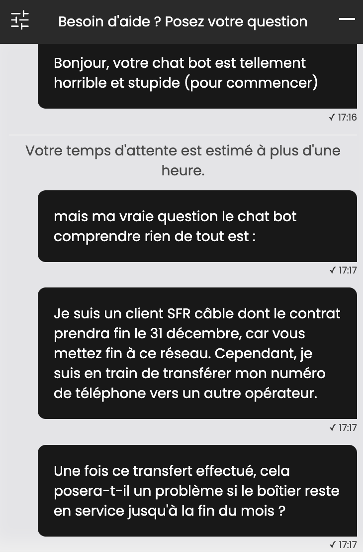 Après 10 minutes des guides inutile avec SeRvIcE cLiEnT dE l’AnNéE, j’ai la possibilité de poser ma question en plus d’une heure #sfr #chatbotdenfer (pour information, je sais quelle entreprise gère leur service client et que le personnel est rémunéré au SMIC)
