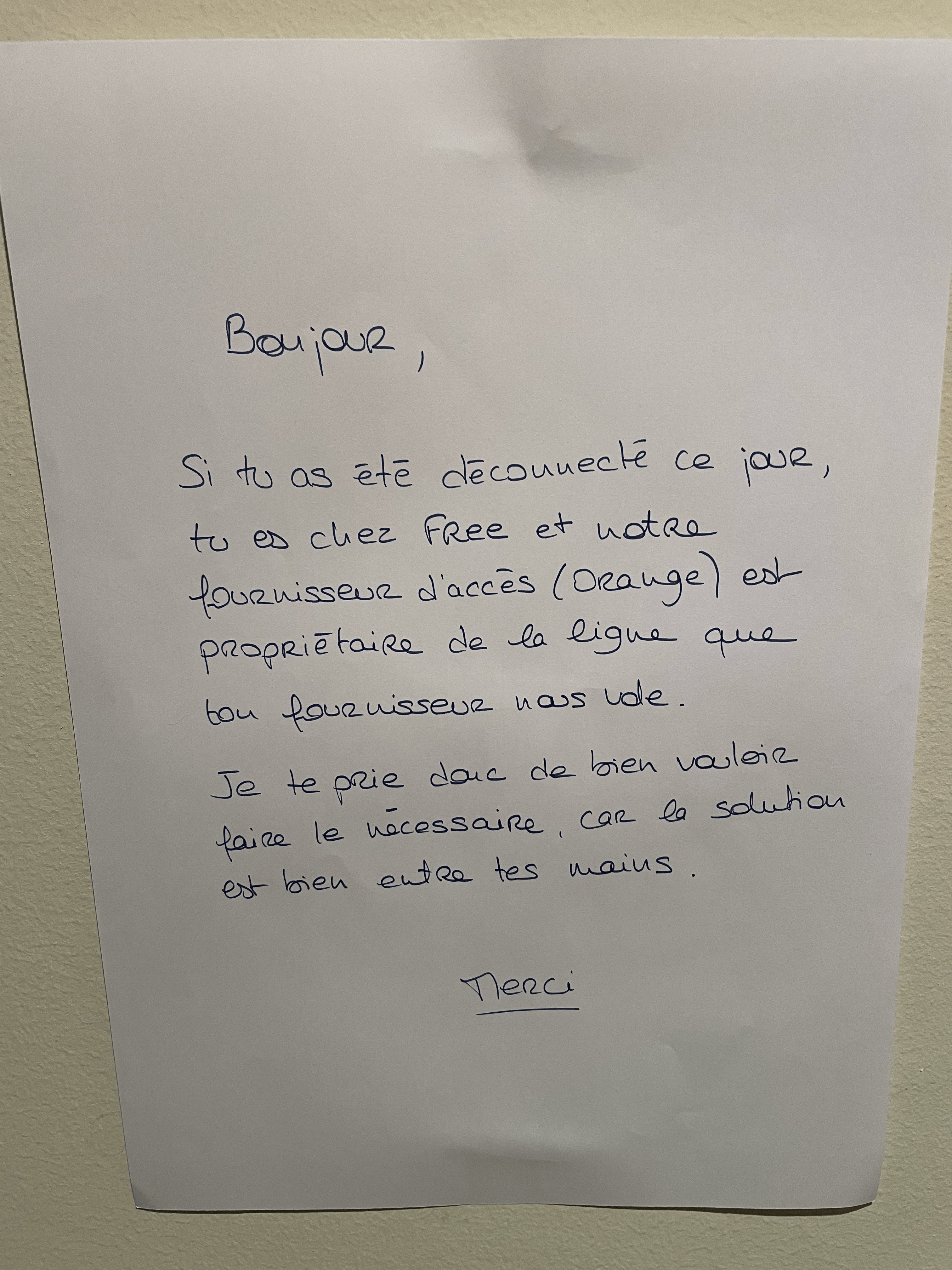 Je pense que la bêtise de SFR mérite d’être racontée : ils ont installé un appartement en branchant un câble à un immeuble en bas de la rue, puis l’ont activé l’immo pour le service. Quand Free est venu me connecter, ils n’ont trouvé aucune installation fibre dans l’immeuble et ce câble au hasard
